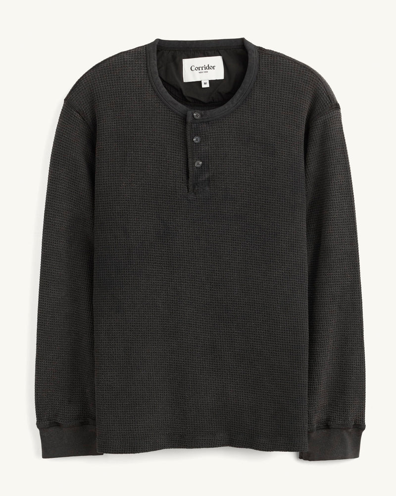 A mid-weight Henley in 100% cotton waffle knit, garment-washed for softness and texture. Finished with a classic three-button placket for structure.