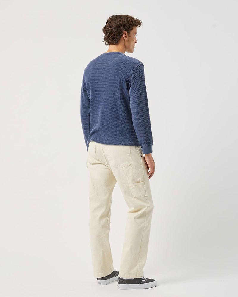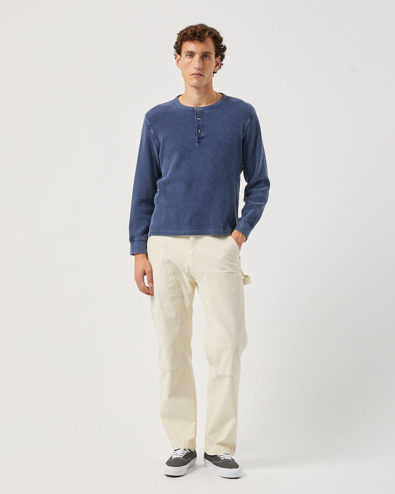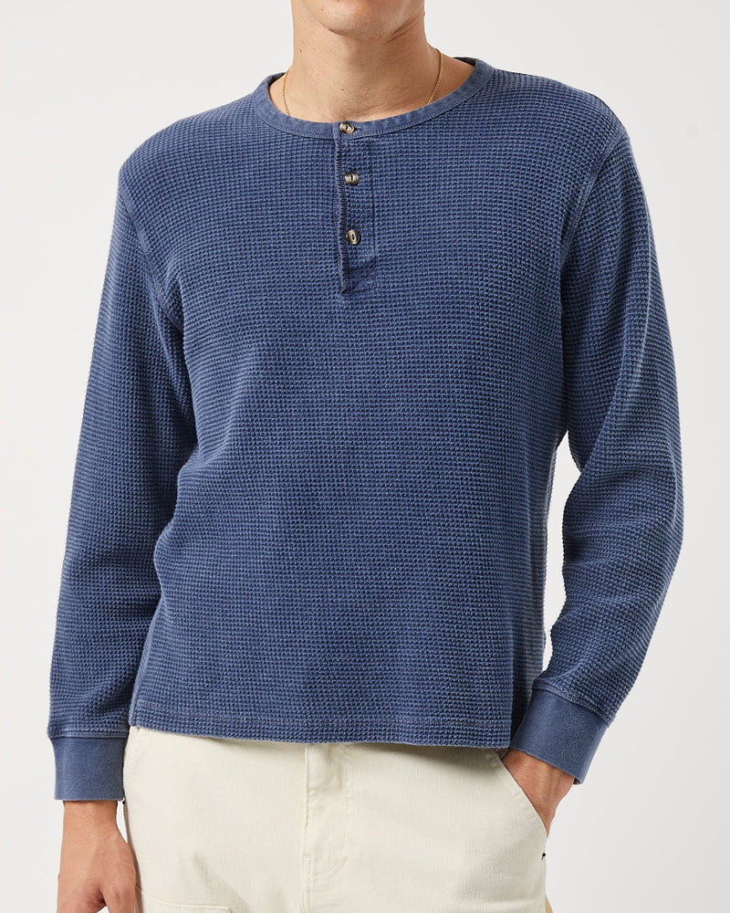 A mid-weight Henley in 100% cotton waffle knit, garment-washed for softness and texture. Finished with a classic three-button placket for structure.